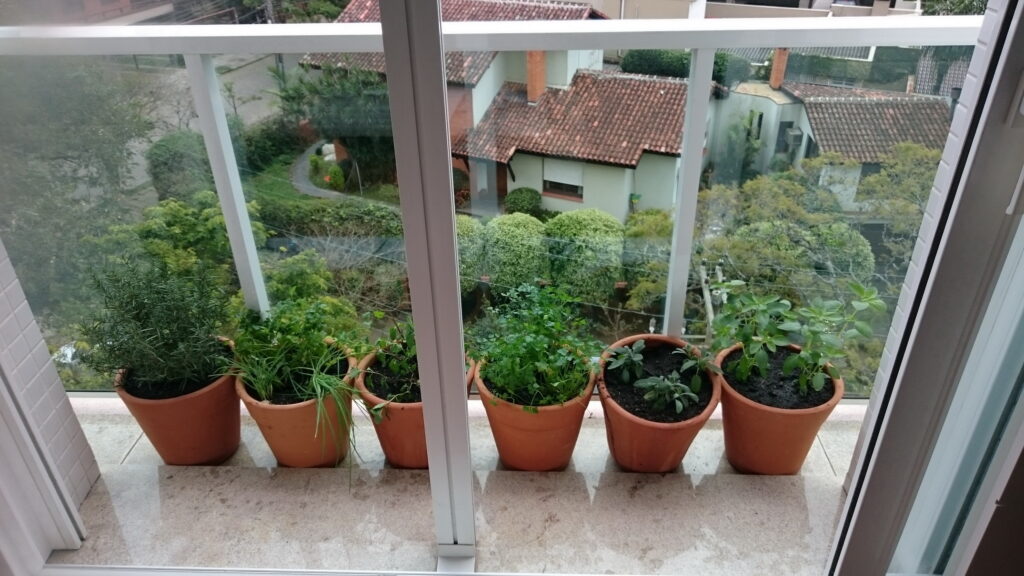 Dá para cultivar temperos e hortaliças em uma sacada estreita de apartamento. Precisa de sol e regar em dias alternados. É importante que a terra usada seja rica em nutrientes para as plantas crescerem saudáveis. Os vasos desta sacada foram planejados por mim e pela arquiteta proprietária do apartamento. Veja o que plantamos em vasos de barro pequenos: